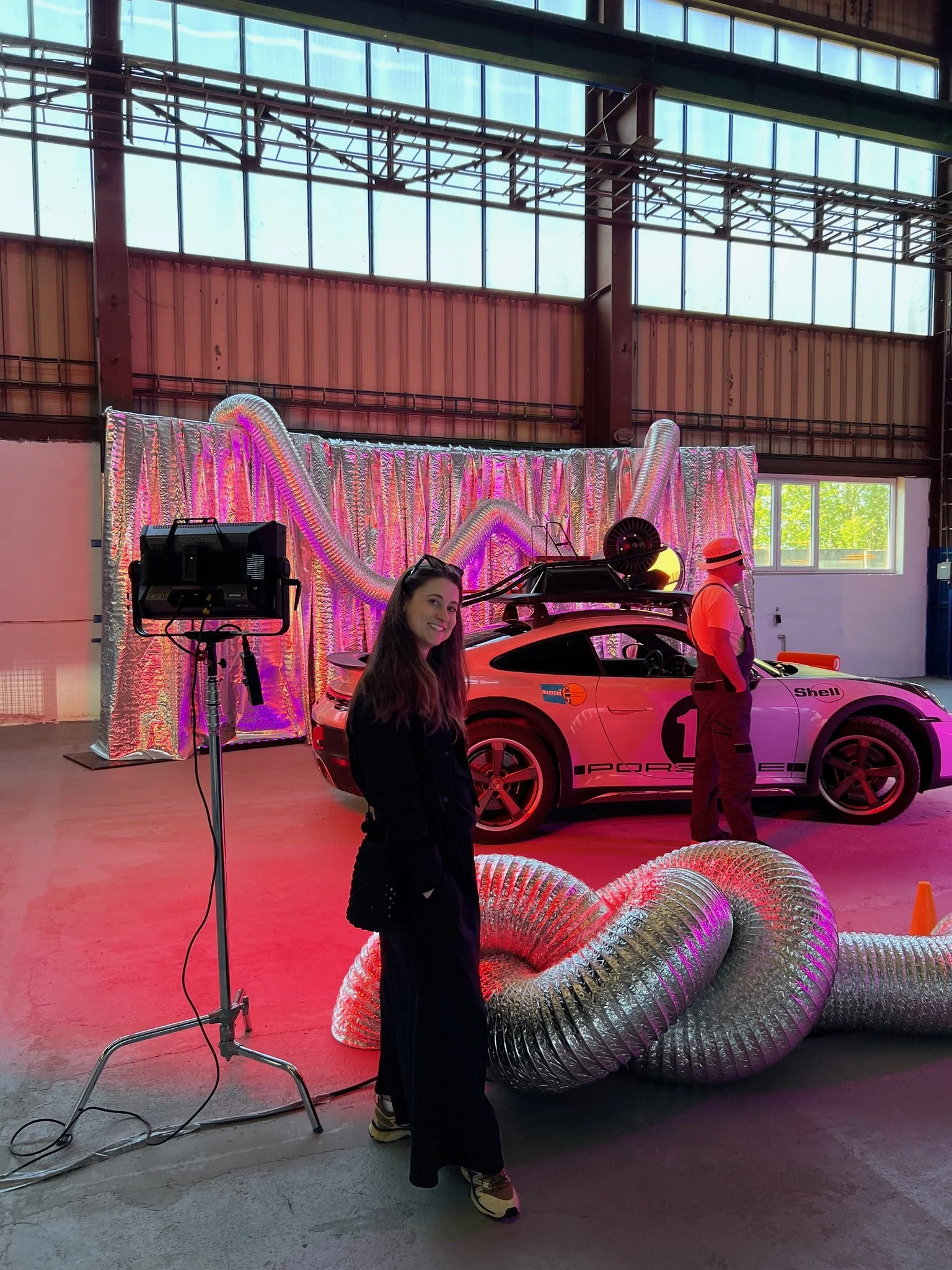 Pro instalaci fotokoutku vznikla scéna založená na práci s flexibilním spirálovým potrubím. Tento materiál vytváří výraznou, téměř futuristickou linii, která rámuje luxusní vůz Porsche a přitahuje pozornost návštěvníků.