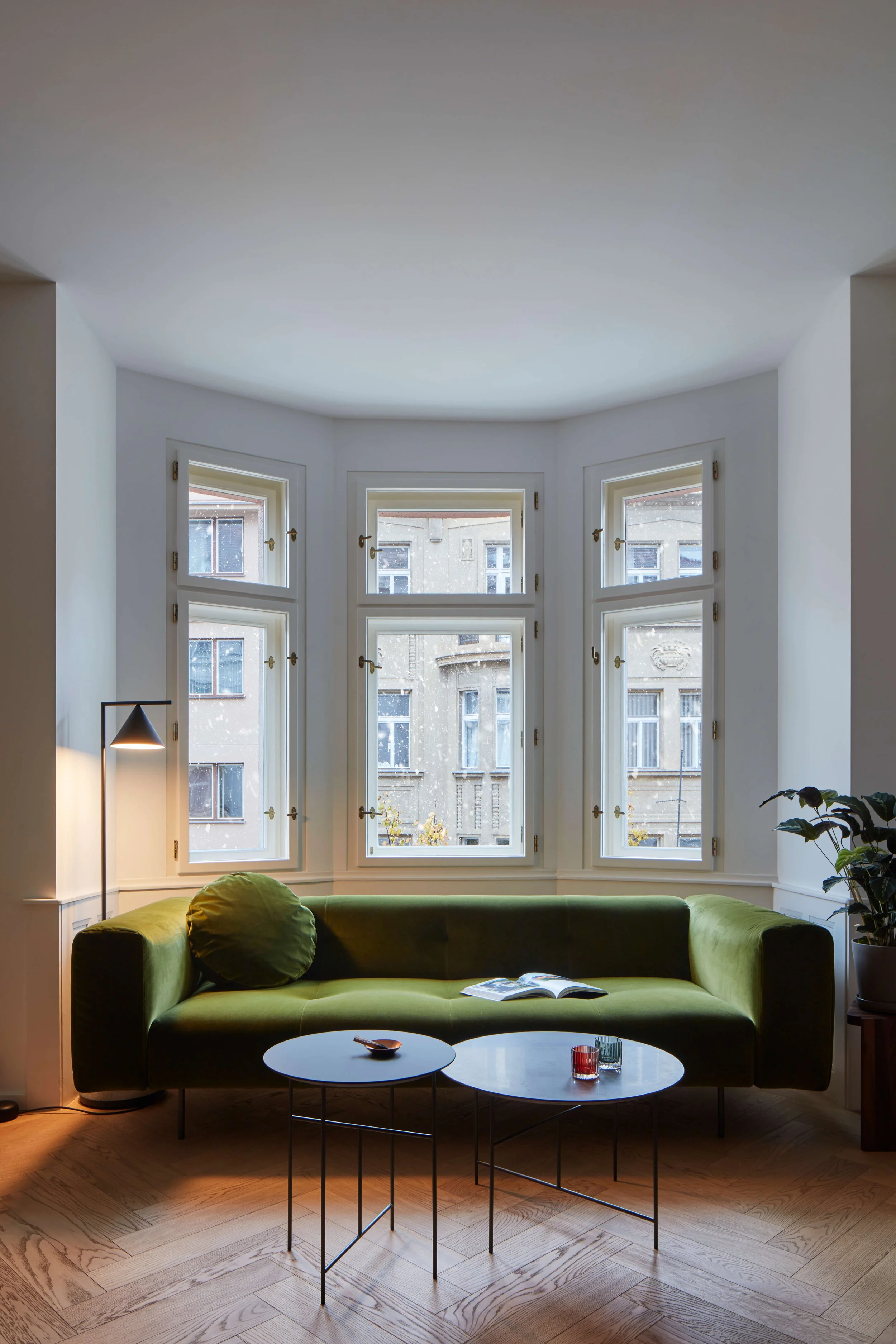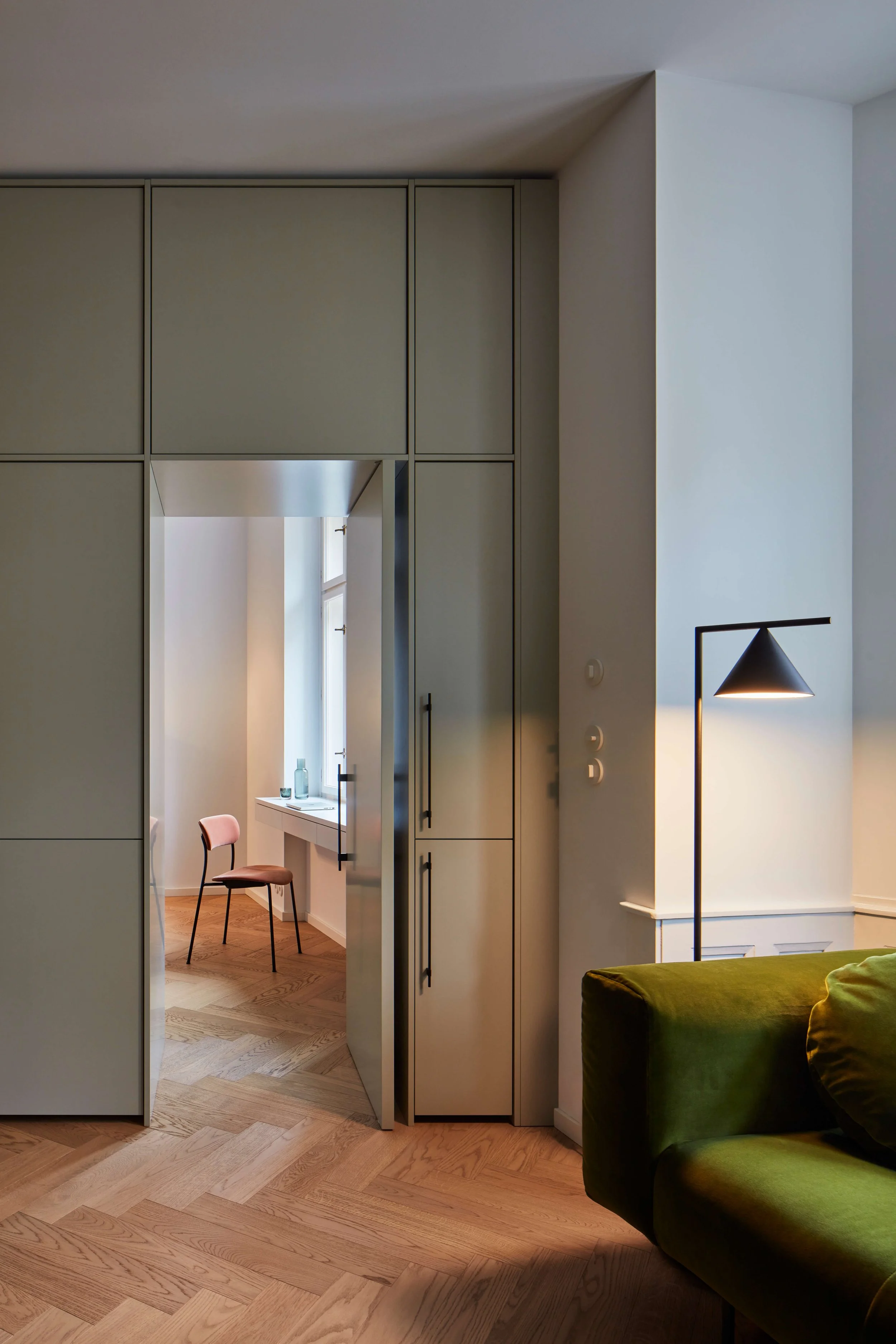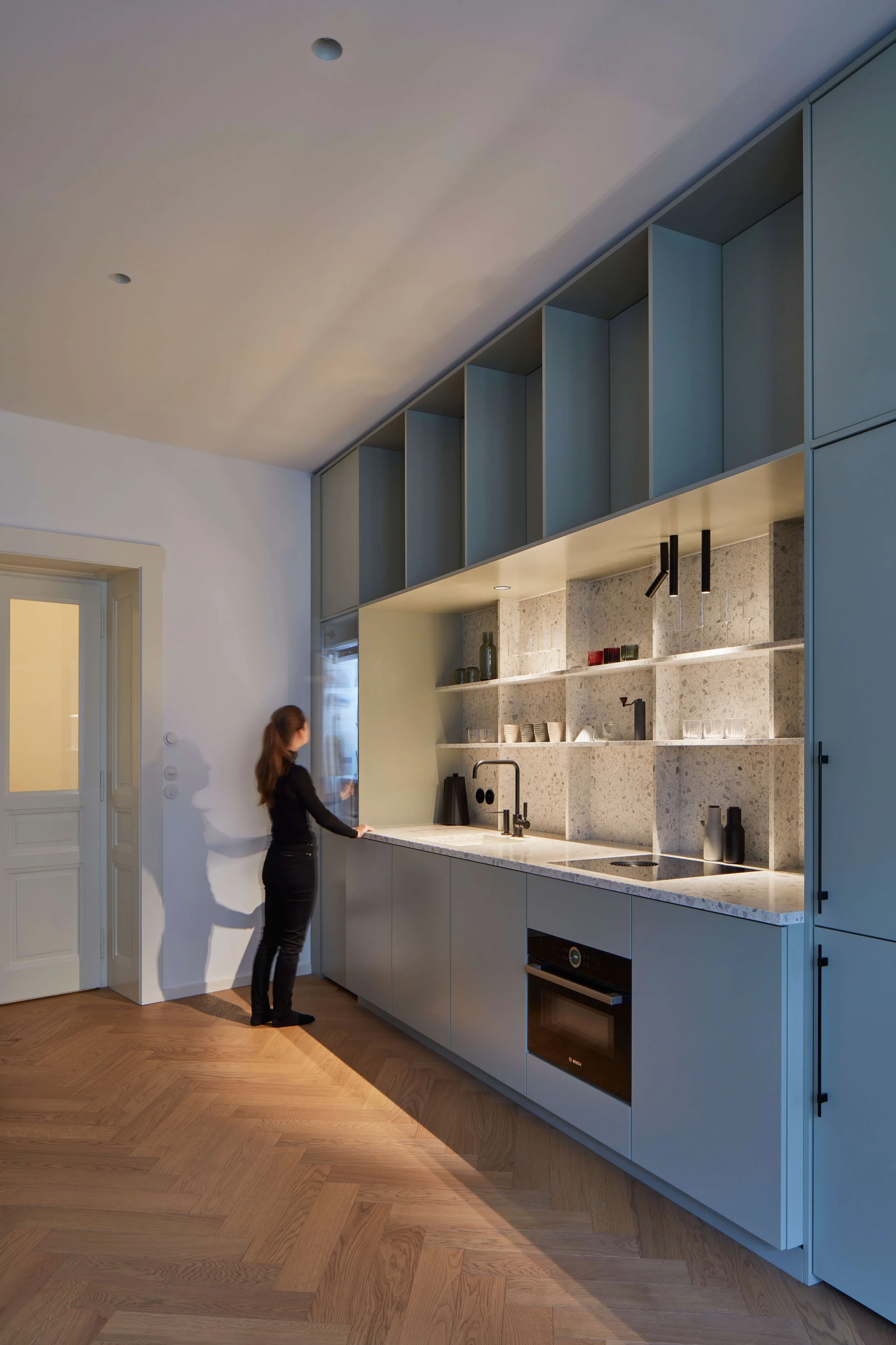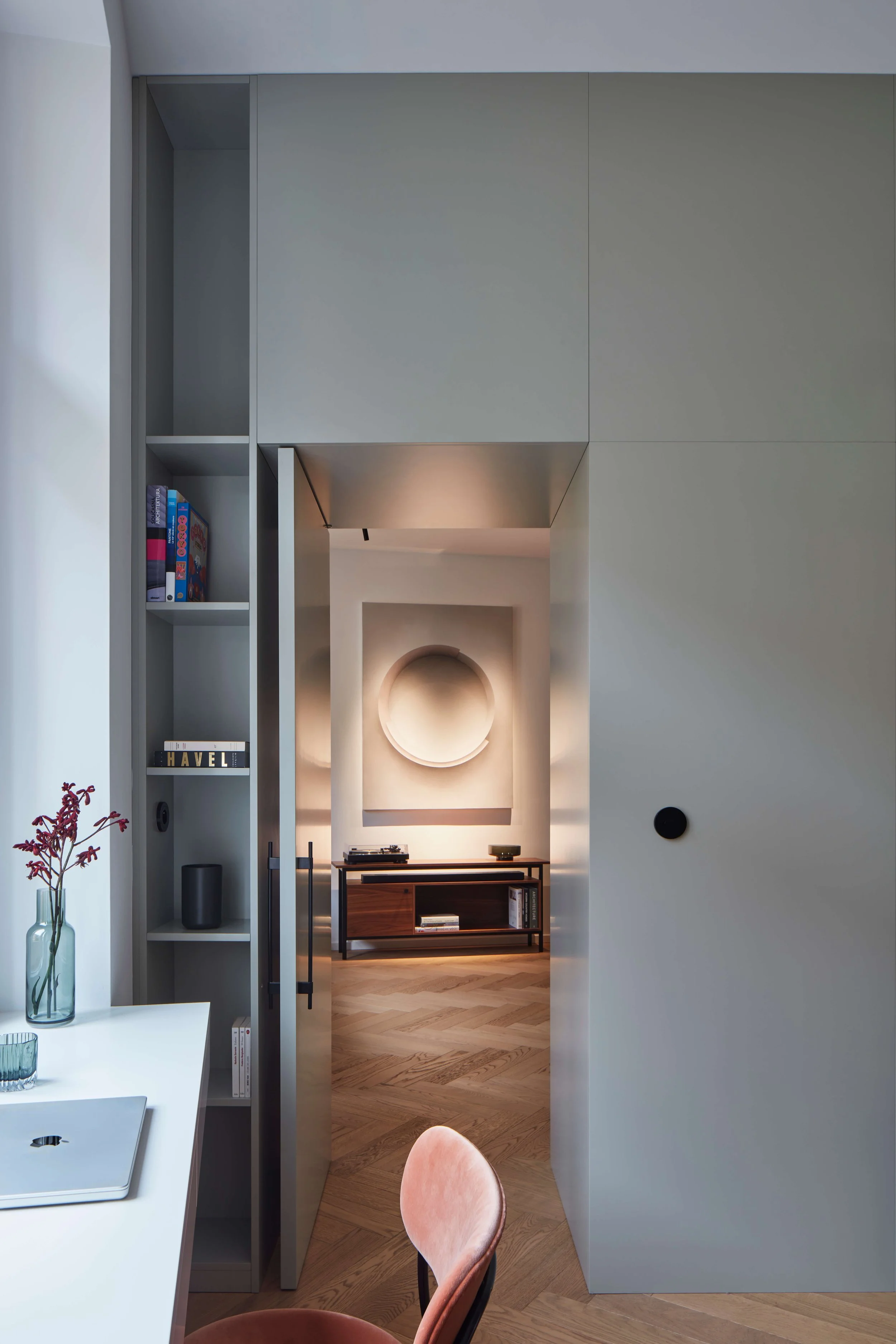 Bylo důležité najít materiály, které mají historickou hodnotu, ale budou použity atypicky. Podstatné je i propojení jednotlivých materiálů napříč celým bytem. Byla použita jednoduchá materialita jako lakovaná MDF, ořechové dřevo, terrazzo, které v různém pojetí a užití dávají každému místu vlastní atmosféru.