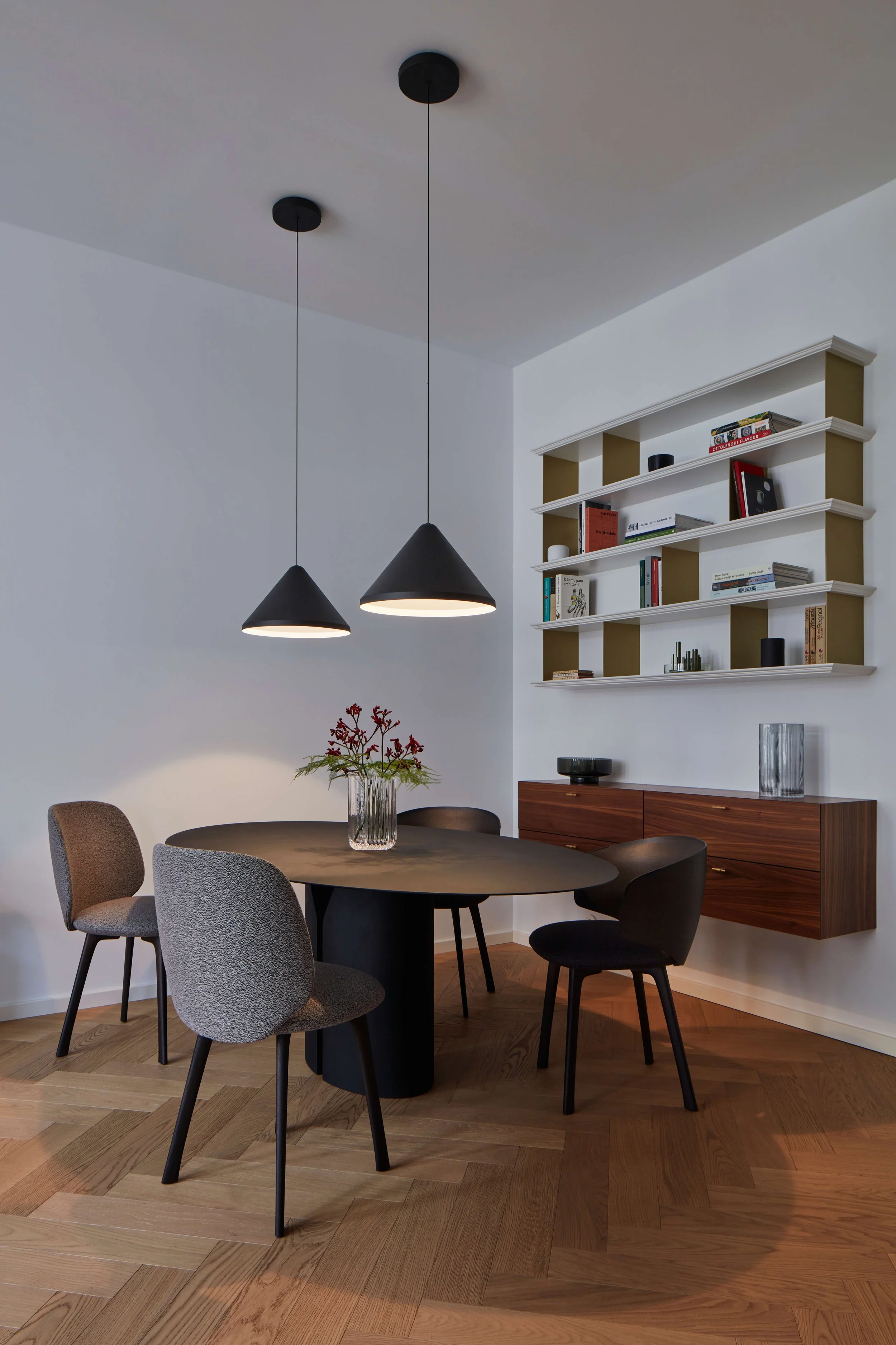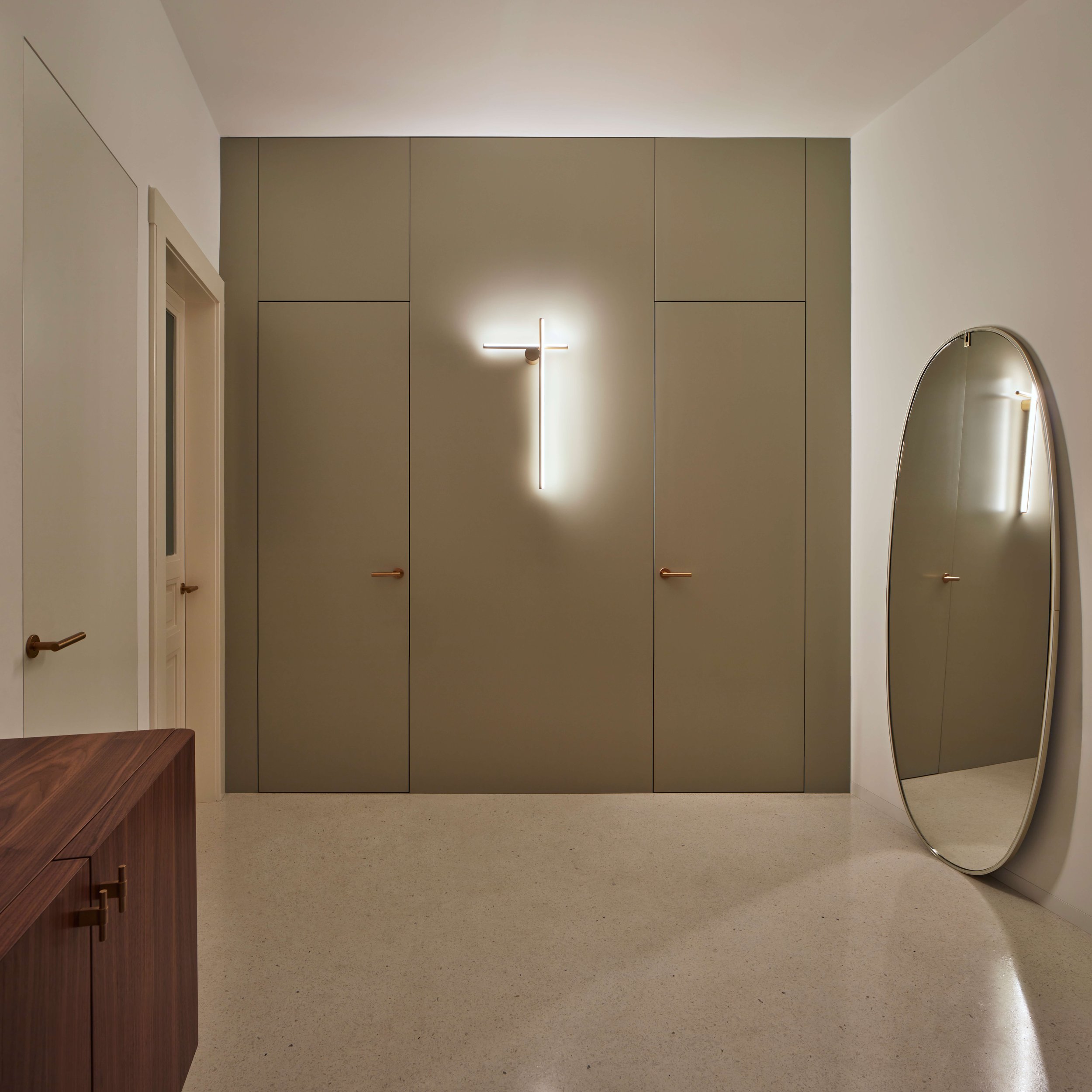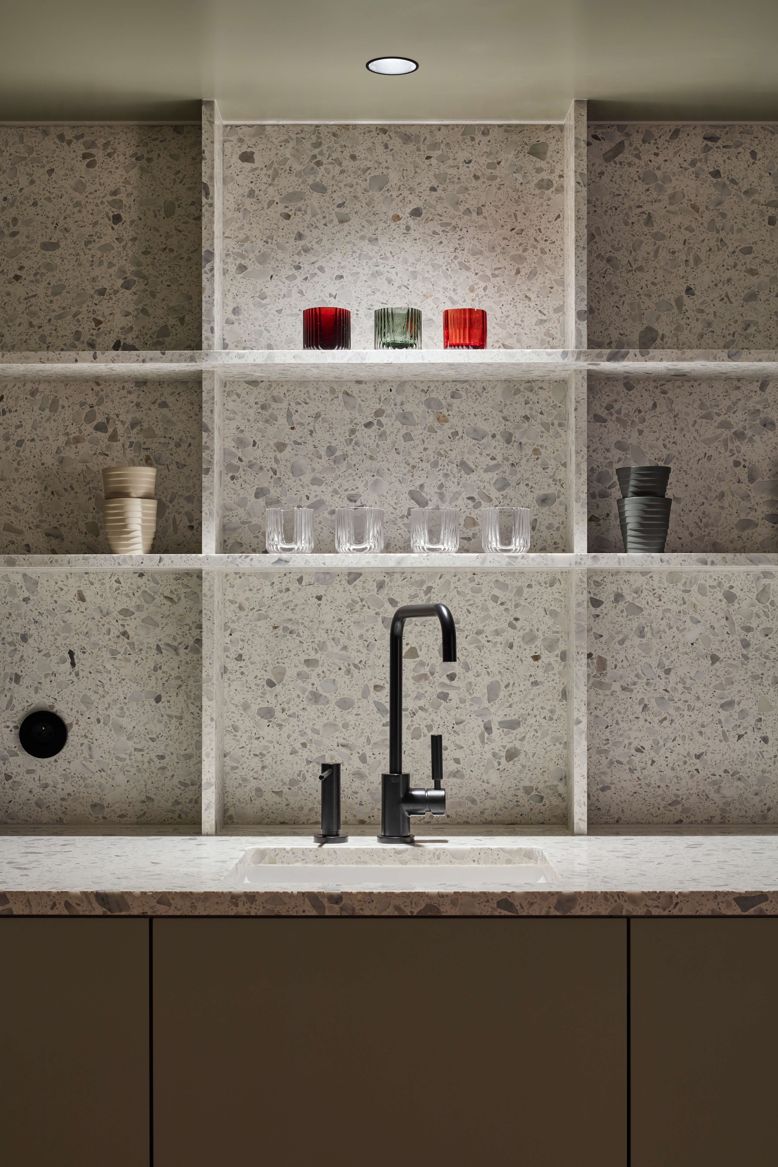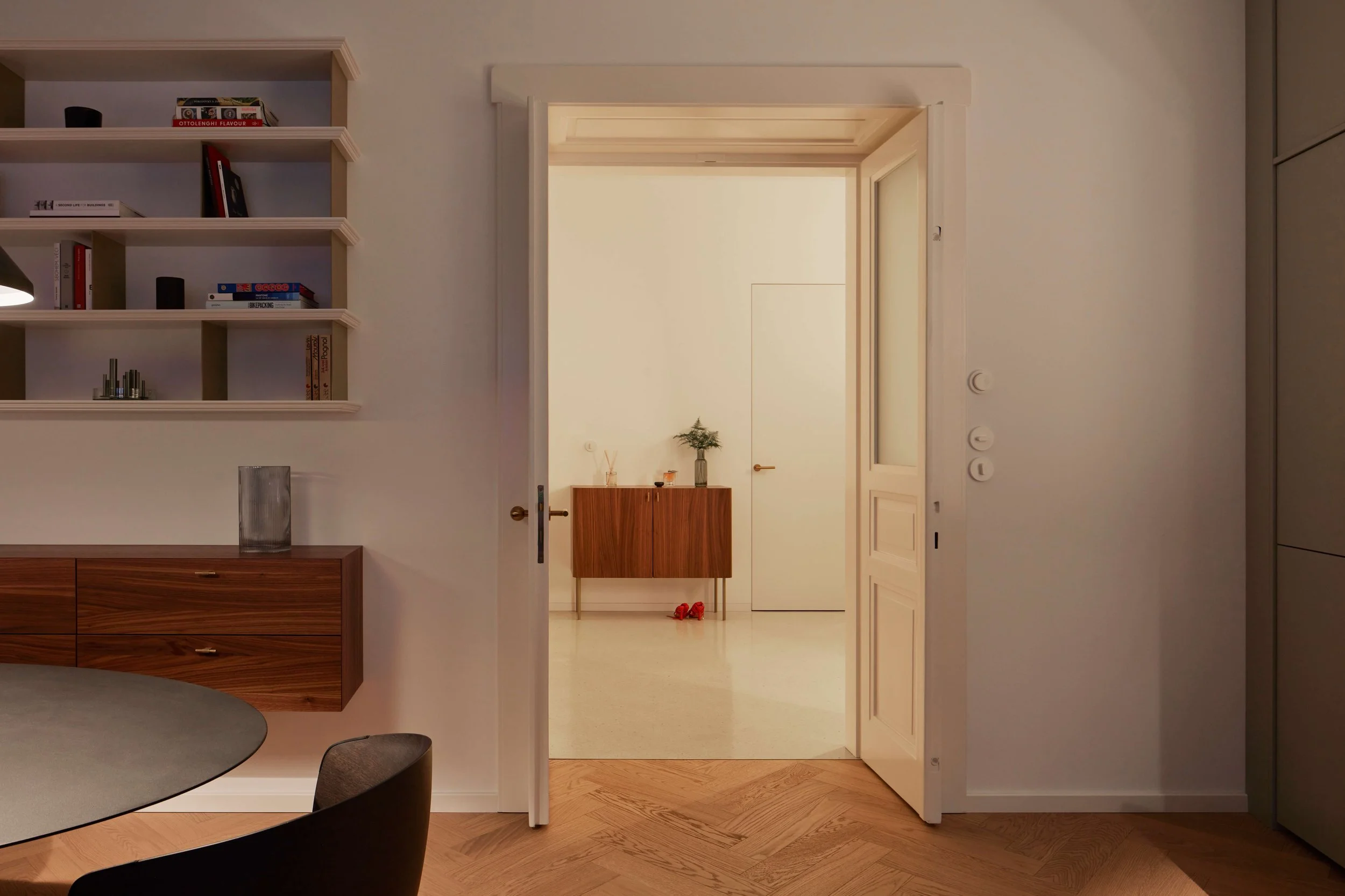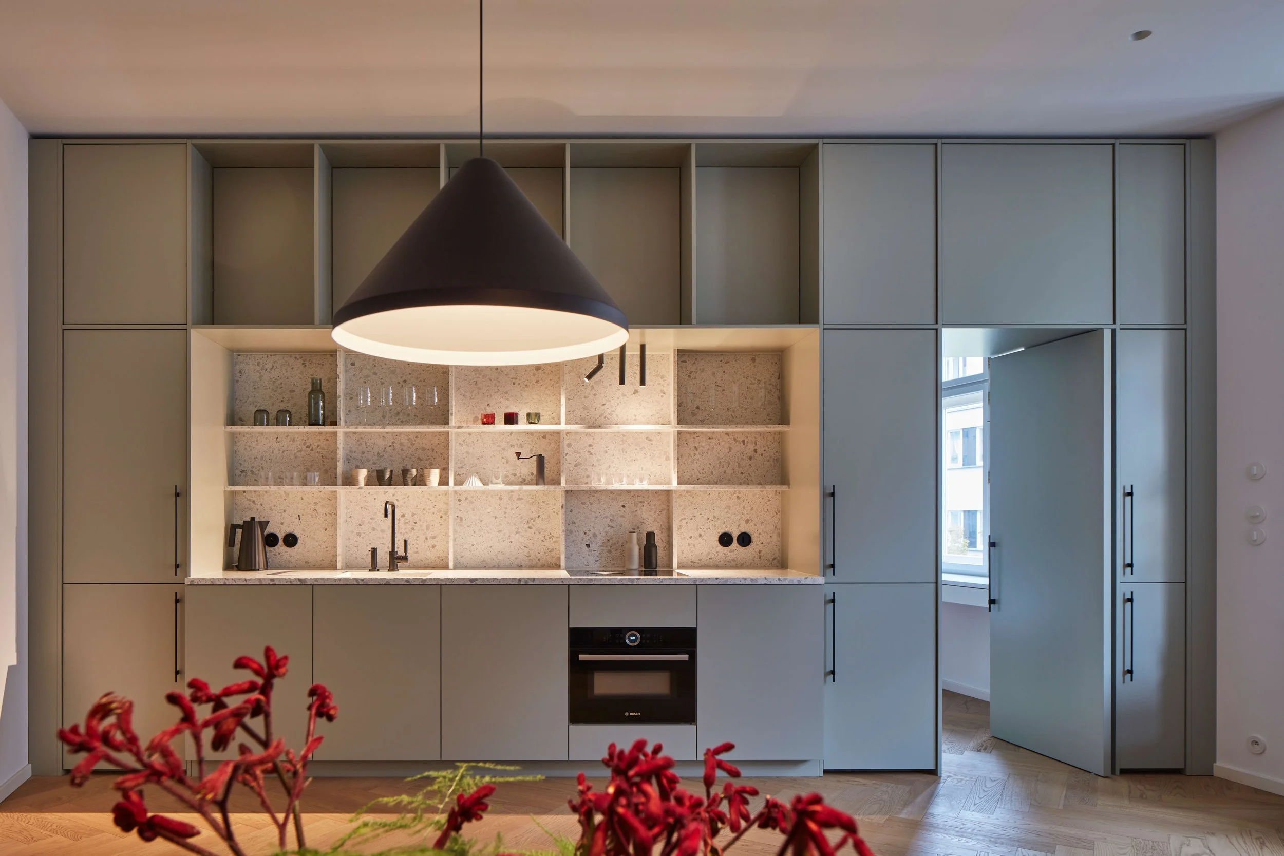 Bylo důležité najít materiály, které mají historickou hodnotu, ale budou použity atypicky. Podstatné je i propojení jednotlivých materiálů napříč celým bytem. Byla použita jednoduchá materialita jako lakovaná MDF, ořechové dřevo, terrazzo, které v různém pojetí a užití dávají každému místu vlastní atmosféru.