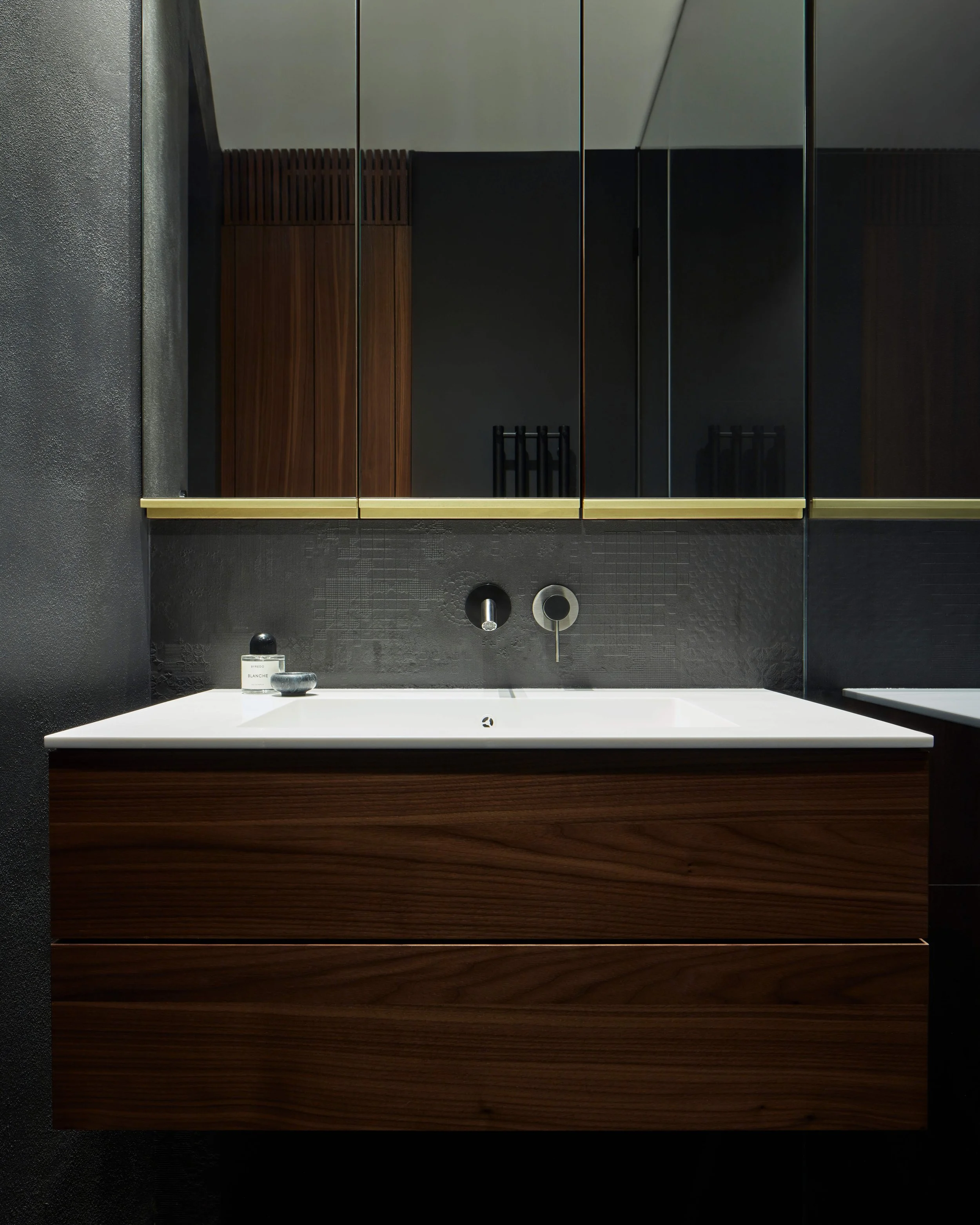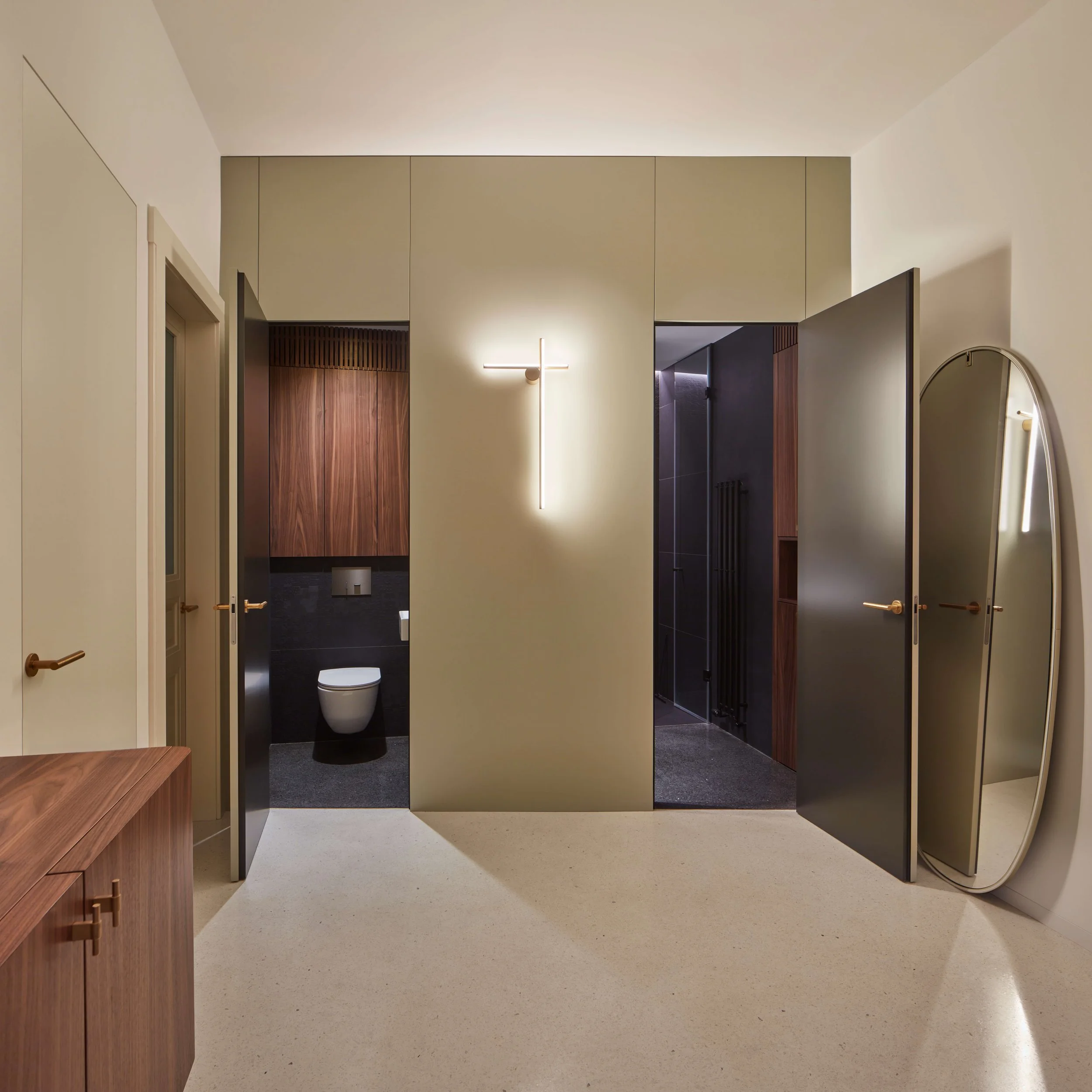 Veškeré zásahy byly dlouho promýšlené, cílem bylo vést jasný dialog mezi původními zachovalými prvky a nově vnesenými řešeními. Interiér pracuje s nadčasovými materiály, promyšlenými detaily ale hlavně s vestavnými nábytky. Záměr bylo vytvořit minimalistické bydlení, které bude respektovat odkaz minulosti ale i požadavky na současný životní styl.