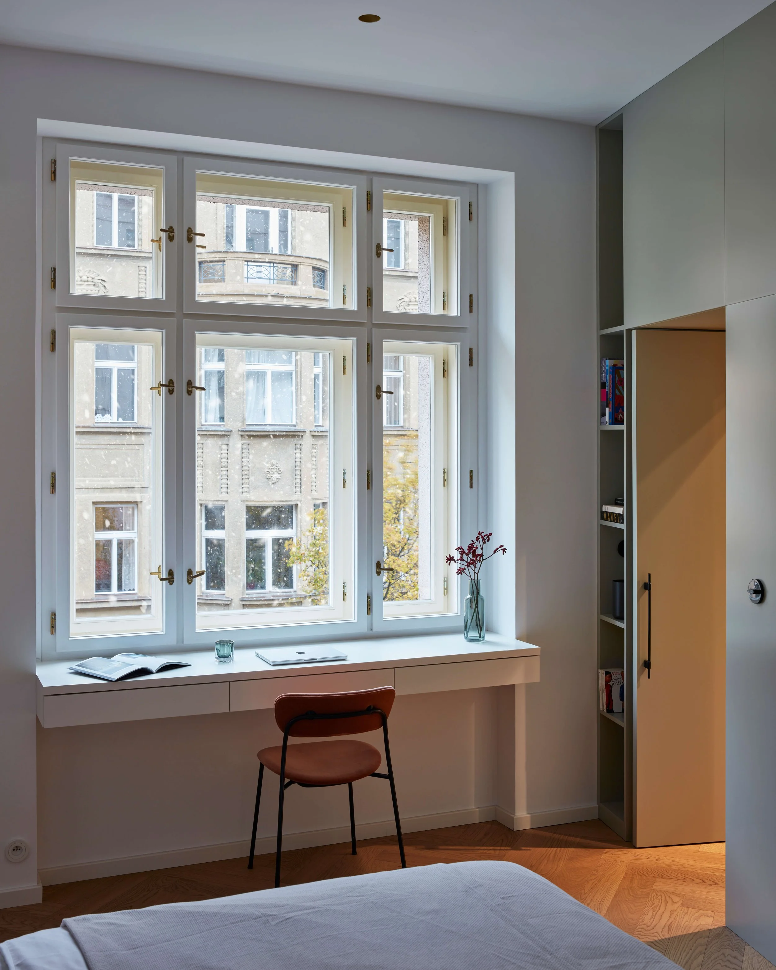 Důležitý moment je motiv průhledů a překvapení, který prostupuje celým bytem a vznikají tak zajímavé momenty. Atypický nábytek umožnil jednotlivá rafinovaná řešení např. rozšířený parapet v ložnici. Slouží jako chvilkové pracovní místo nebo stolek na líčení.